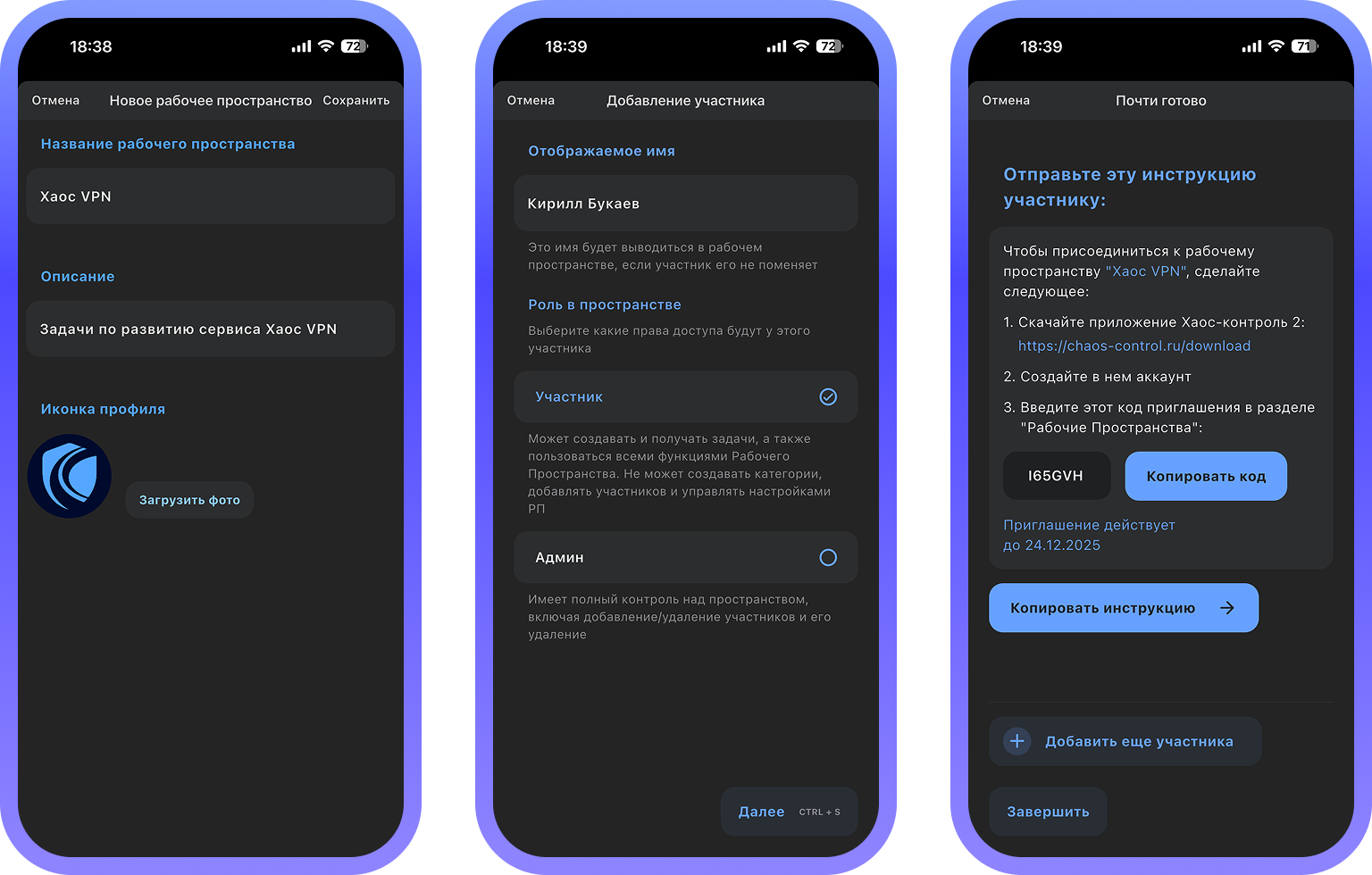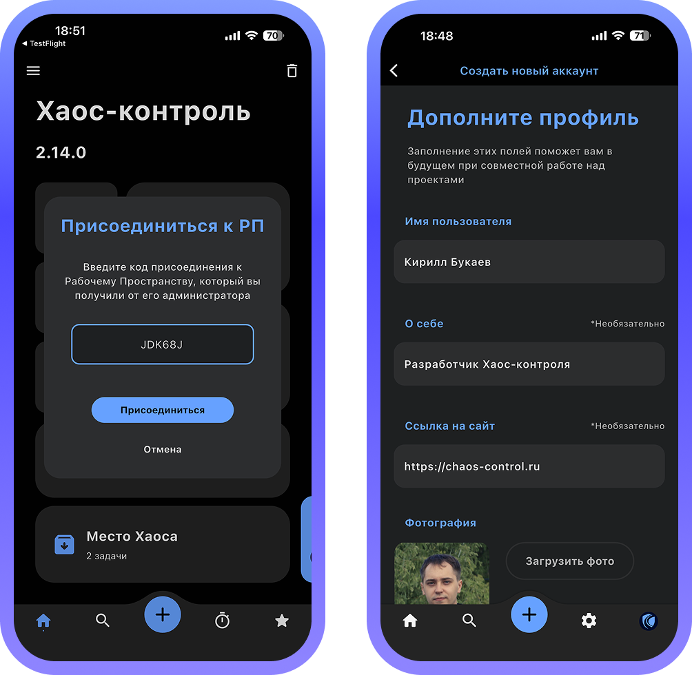 Каждый из участников может присоединиться к созданному вами рабочему пространству по коду приглашения и заполнить свой профиль, который будет отображаться в рабочем пространстве: