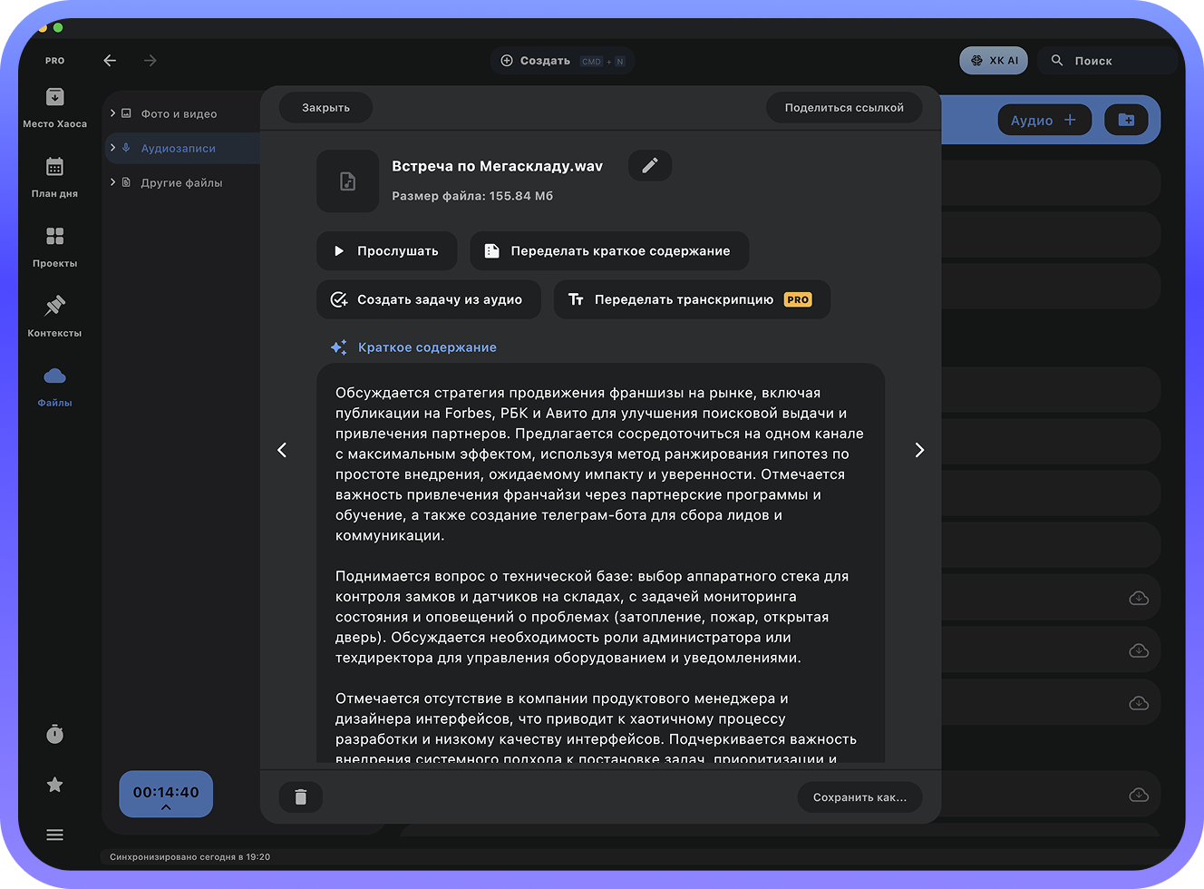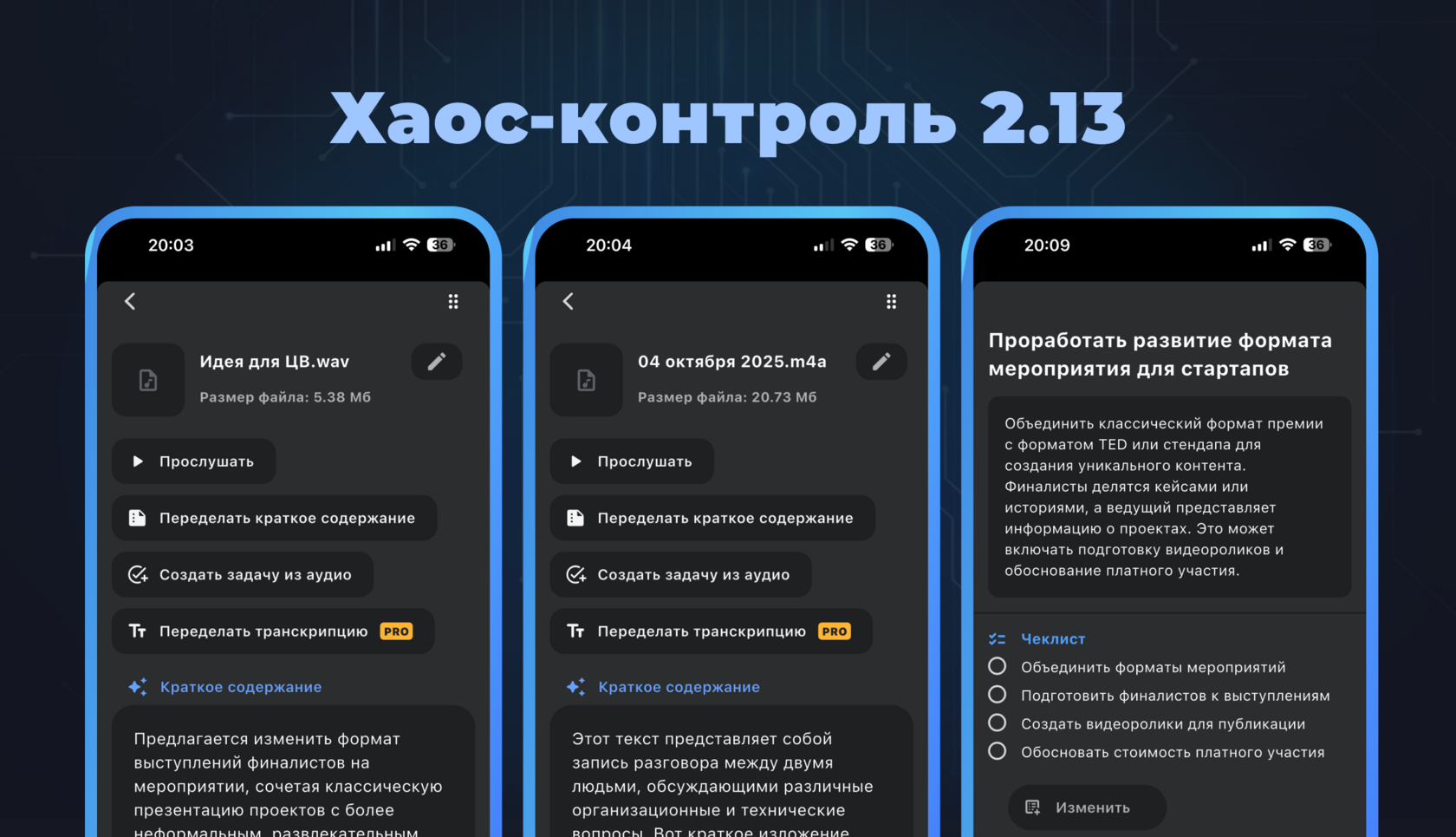 Обратите внимание, что если вы активно проводите онлайн-звонки, то вы можете добавлять их записи в Хаос-контроль и получать саммари встреч. Кстати, в версии 2.13.1 планируем добавить эту возможность и для видео-файлов.