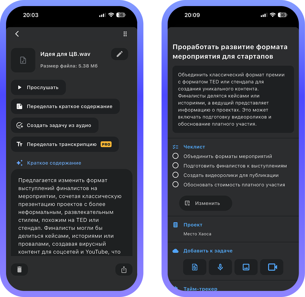 Также появилась возможность проанализировать аудио-заметку или запись разговора на предмет звучащей в ней задачи. ХК AI сам предложит вариант формулировки задачи и ее описания исходя из того, что звучит в аудио.