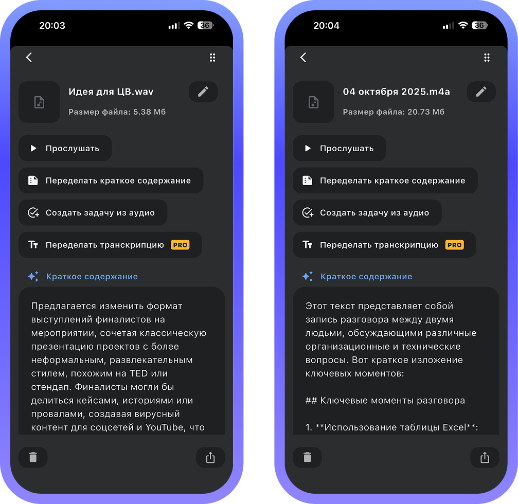 После создания транскрипции появляется возможность сделать на ее основе саммари, то есть краткое содержание аудио-заметки или разговора. Идеально подходит для того, чтобы подвести итоги встречи и зафиксировать в текстовом виде какие темы обсудили, какие решения приняли и какие задачи поставили.
