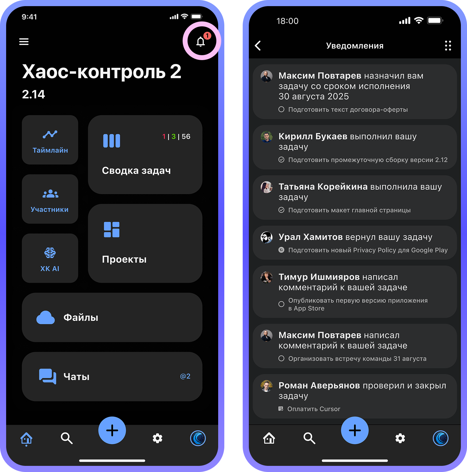 Также, в самом Хаос-контроле информация о новой задаче будет содержаться в специальном разделе уведомлений:
