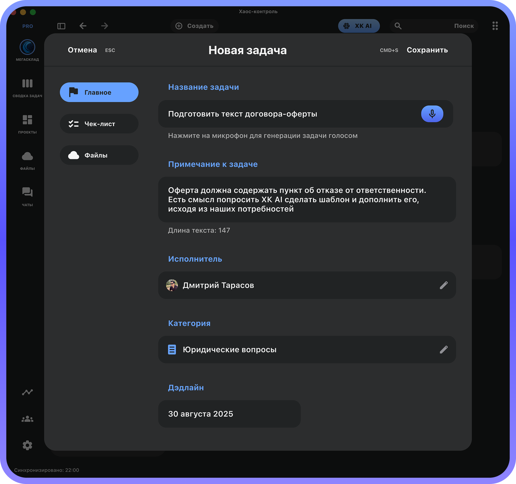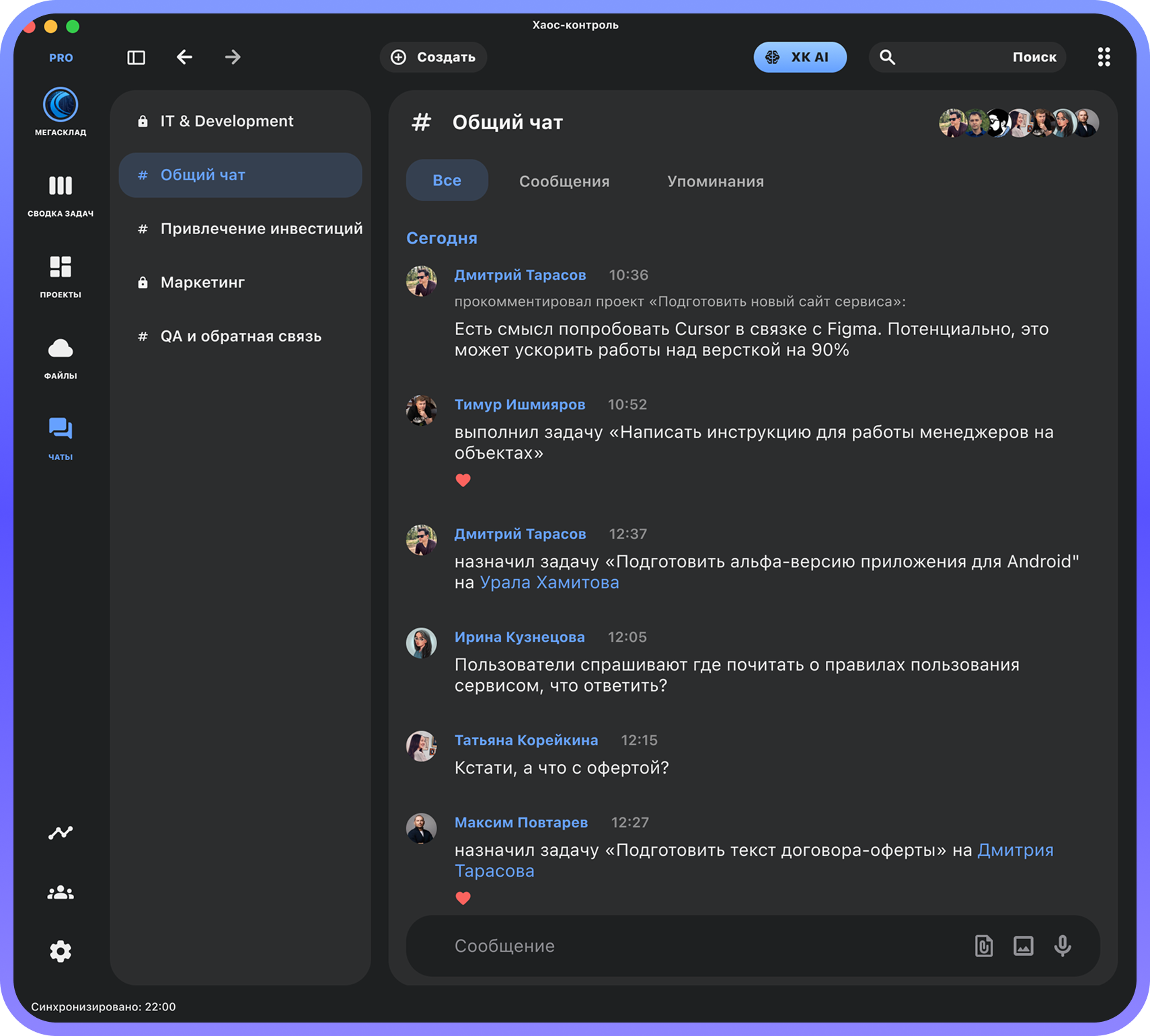 Обратите внимание, что все изменения задачи и связанные события автоматически транслируются в разделе «Общий чат» в чатах Хаос-контроля: