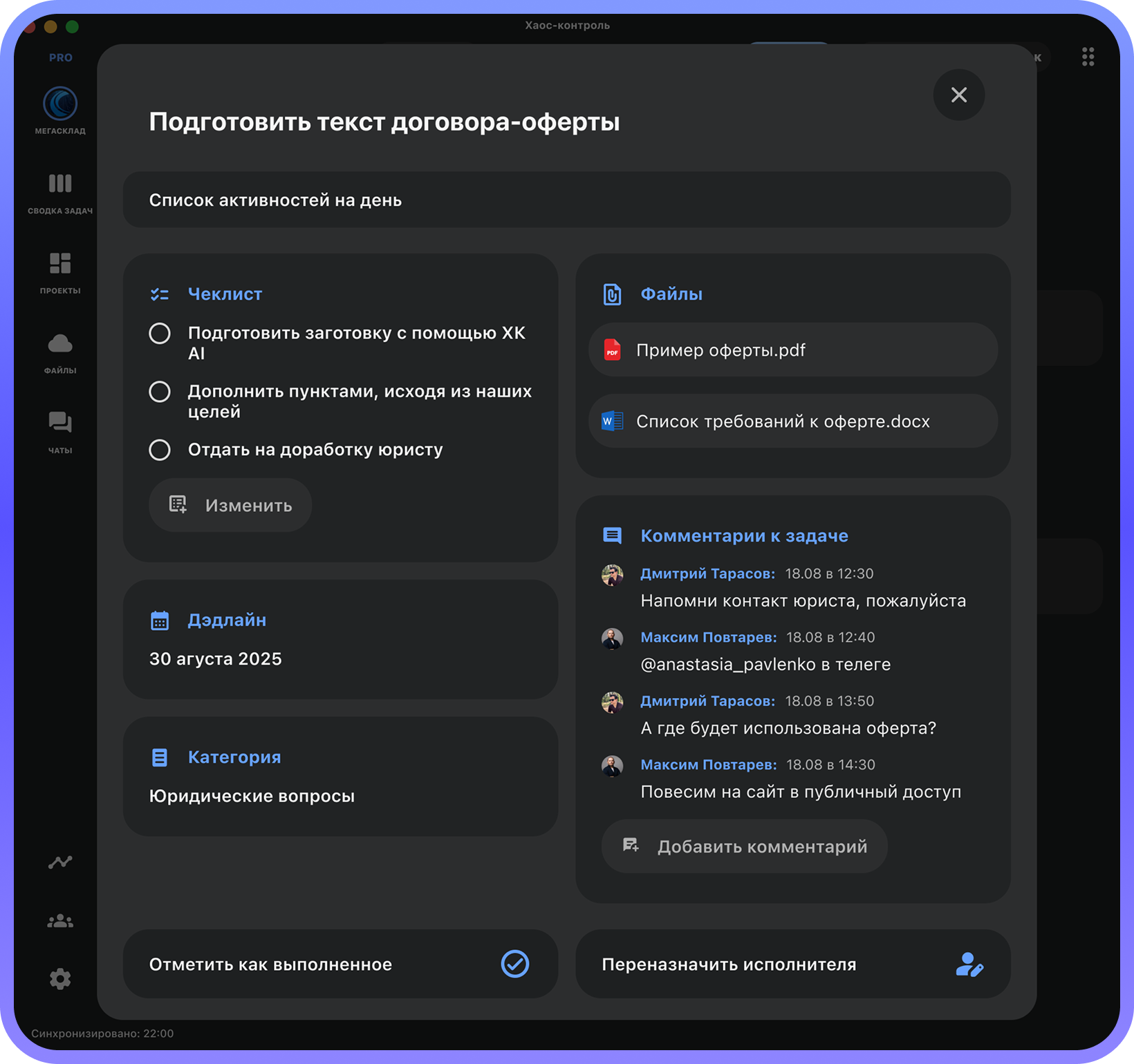 Как видите, Хаос-контроль для Команд предоставляет простой способ быстро назначить задачу, обсудить ее и держит всех причастных в курсе о прогрессе работы.